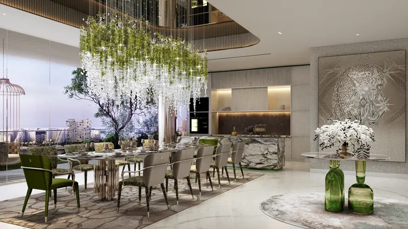 The exclusive sky collection introduces a plethora of amenities and advantages that elevate the living experience to unprecedented heights. From everlasting sea views to floating relaxation pods, each aspect is meticulously designed to immerse residents in a world of unparalleled luxury. The Cavalli Museum & Art and Fashion Studio, infinity pools, zero-gravity dream pods, and a tropical spa create an atmosphere where every desire is met. Indulge in the Cavalli-inspired diner, a culinary journey that reflects the sophistication of the brand. The carefully curated menu offers a blend of flavors, complementing the overall theme of opulence that defines the sky collection.